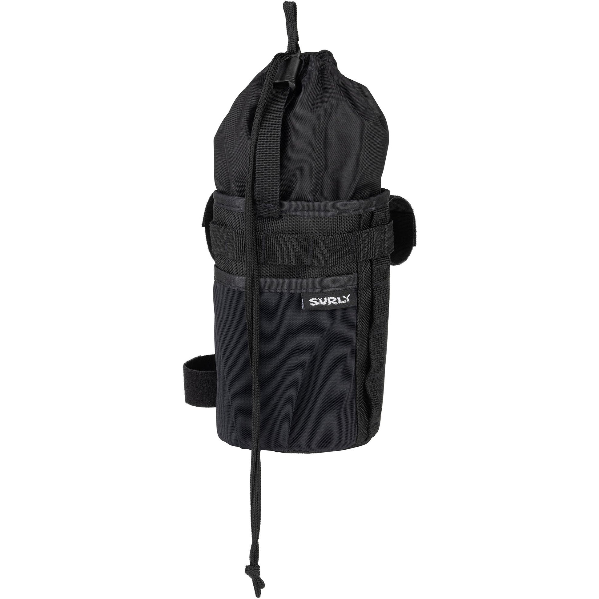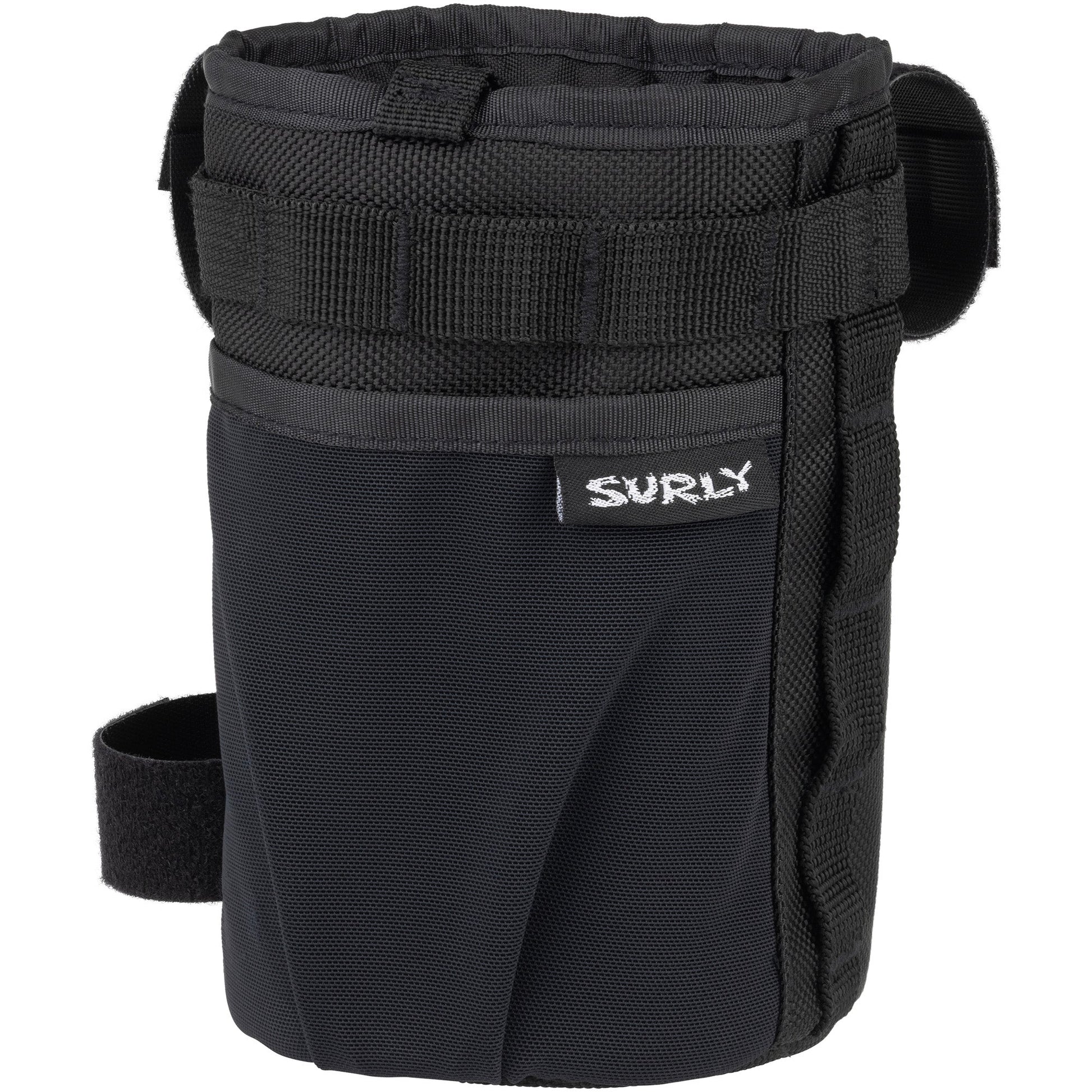 The Surly Dugout Bag is a handy vessel for sips, snacks, and all other substances in need of secure yet accessible attachment. Engineered with one-handed operation in mind, interior cargo and exterior pockets keep all replenishing necessities at an arm’s length. This bag mounts onto any size handlebar and frame with four connection points and offers a cozy spot for 3 pounds of cool-looking rocks or any 1-liter beverage of your choosing.